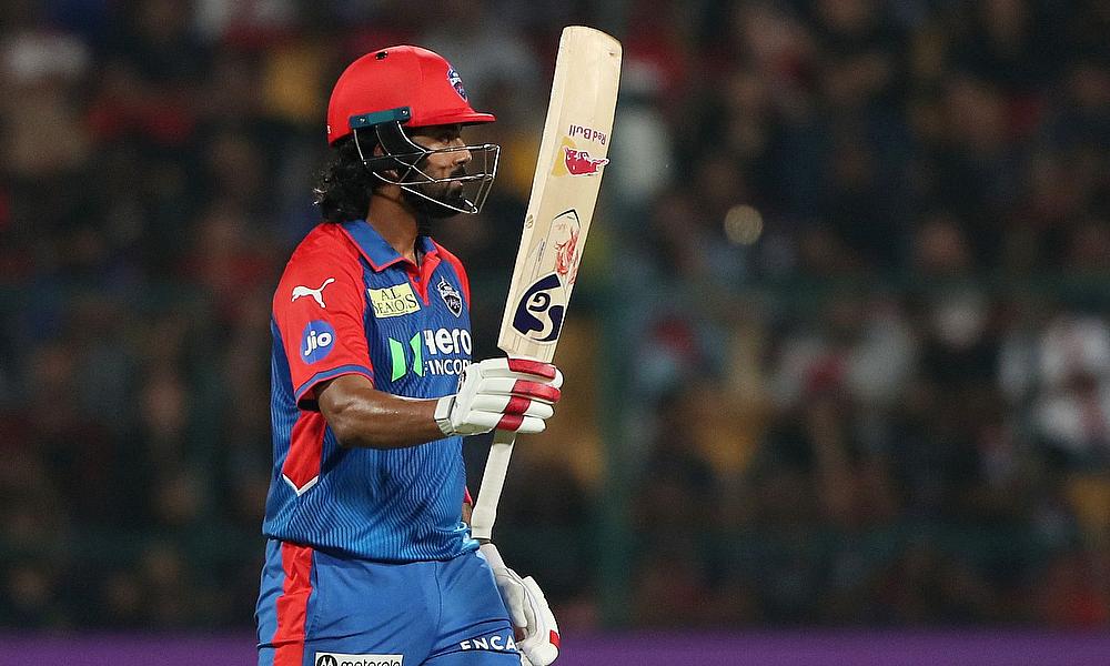 Delhi Capitals' KL Rahul celebrates after reaching his half century