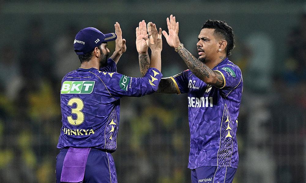 Kolkata Knight Riders' Sunil Narine celebrates with teammates