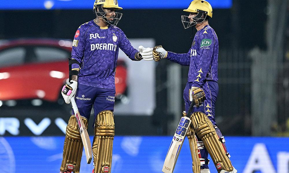 Kolkata Knight Riders' Quinton de Kock and Sunil Narine react
