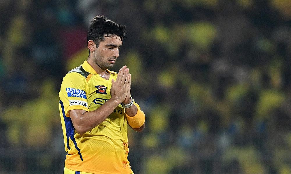 Chennai Super Kings's Anshul Kamboj celebrates after taking the wicket of Kolkata Knight Riders' Quinton de Kock