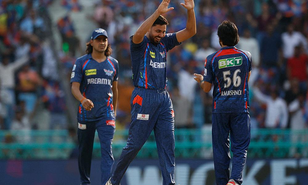 Lucknow Super Giants' Avesh Khan celebrates after taking the wicket of Gujarat Titans' Shubman Gill