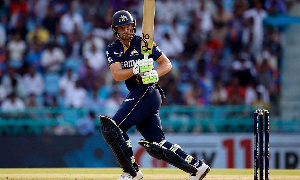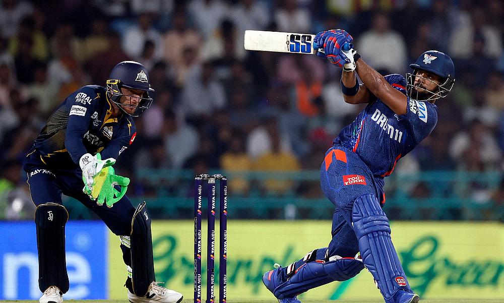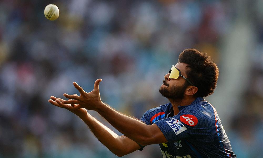 Lucknow Super Giants' Shardul Thakur takes a catch to dismiss Gujarat Titans' Jos Buttler off the bowling of Lucknow Super Giants' Digvesh Rathi