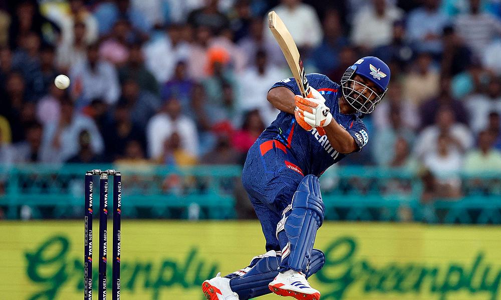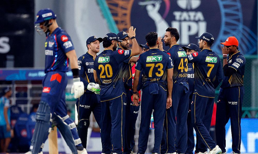 Gujarat Titans players celebrate the wicket of Lucknow Super Giants' Rishabh Pant