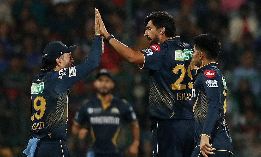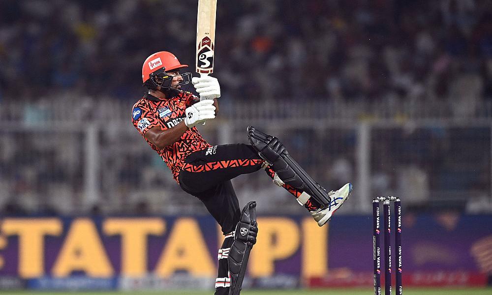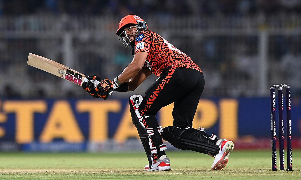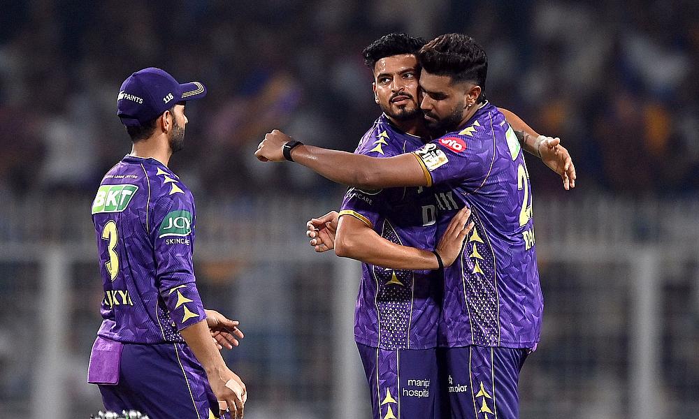 Kolkata Knight Riders' Vaibhav Arora celebrates with teammates after taking the wicket of Sunrisers Hyderabad's Heinrich Klaasen, caught by Moeen Ali