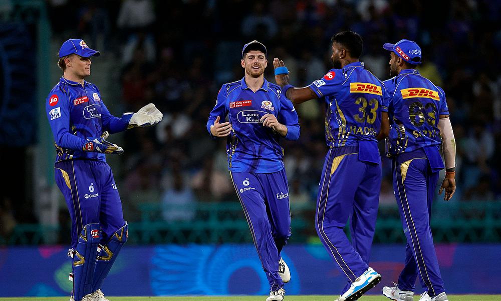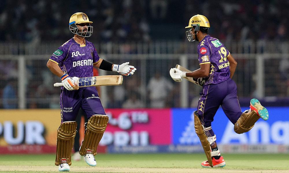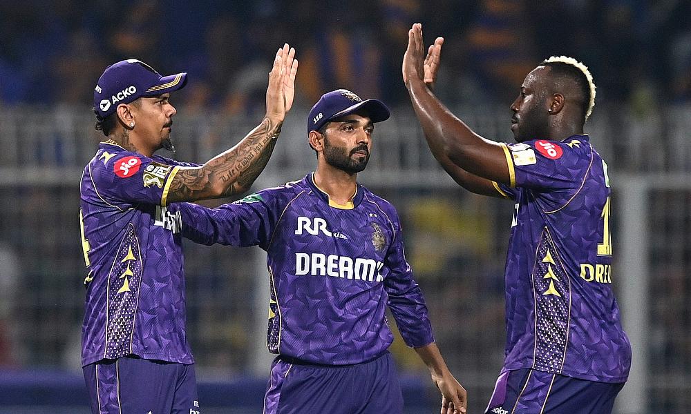 Kolkata Knight Riders' Andre Russell celebrates with teammates after taking the wicket of Sunrisers Hyderabad's Nitish Kumar Reddy, caught by Sunil Narine