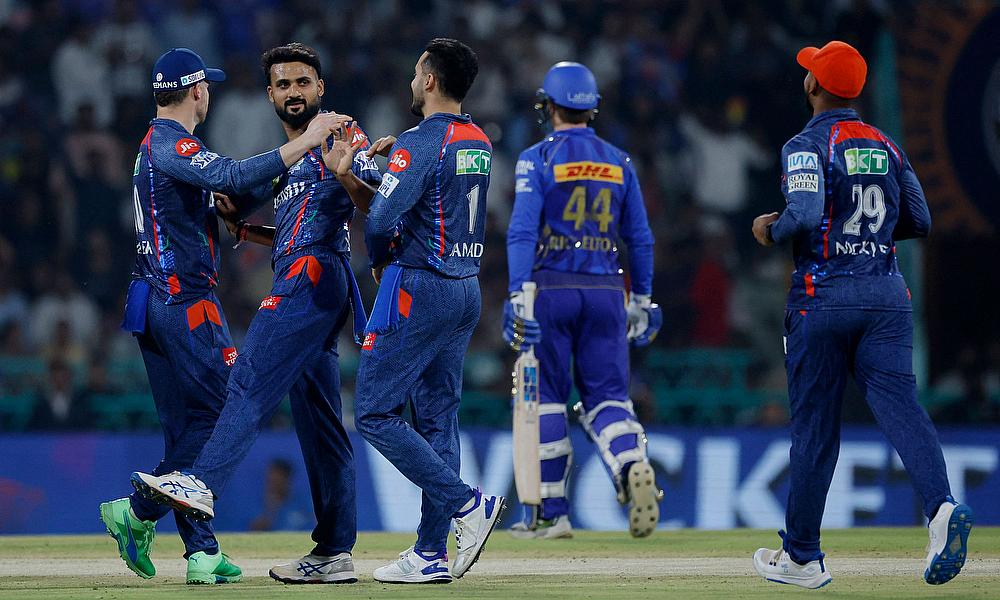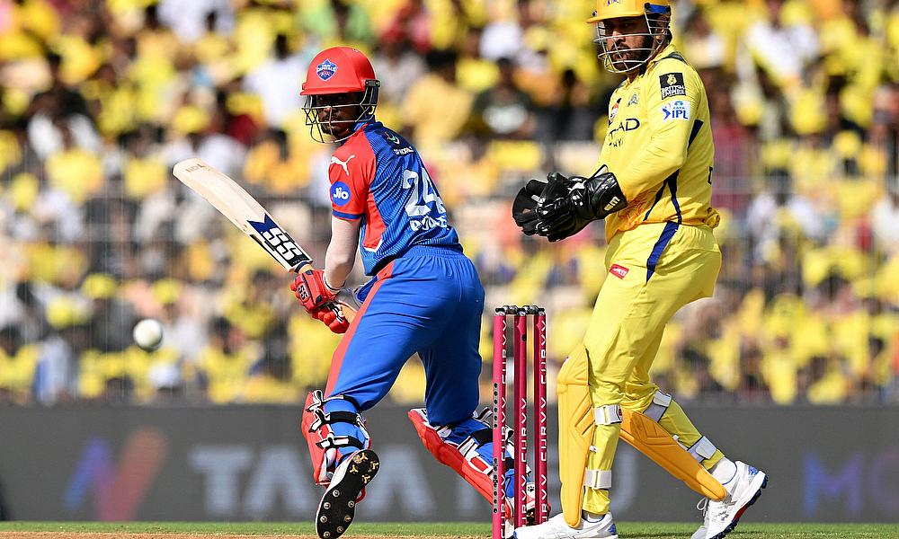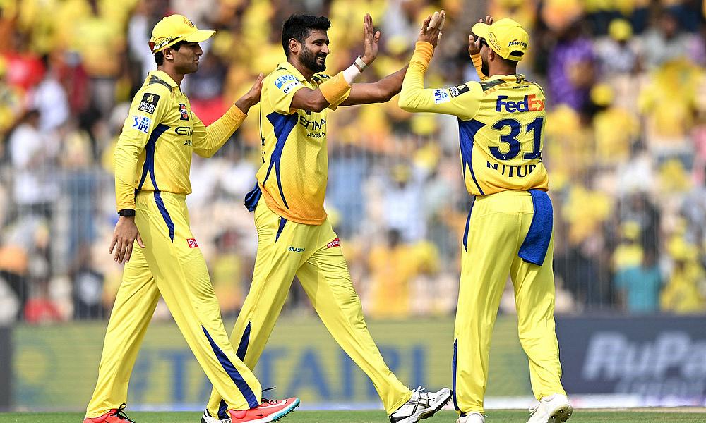 Chennai Super Kings' Khaleel Ahmed celebrates with teammates after taking the wicket of Delhi Capitals' Jake Fraser-McGurk, catch taken by Ravichandran Ashwin