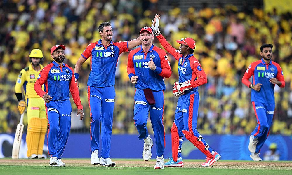 Delhi Capitals' Mitchell Starc celebrates with teammates after taking the wicket of Chennai Super Kings' Ruturaj Gaikwad, catch taken by Jake Fraser-McGurk