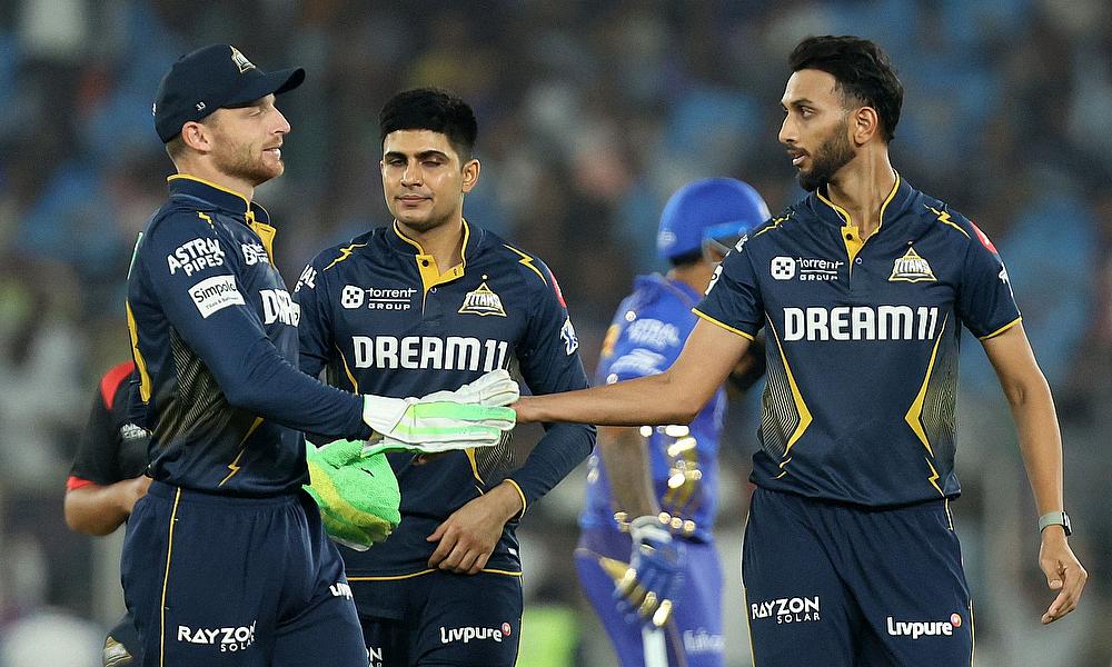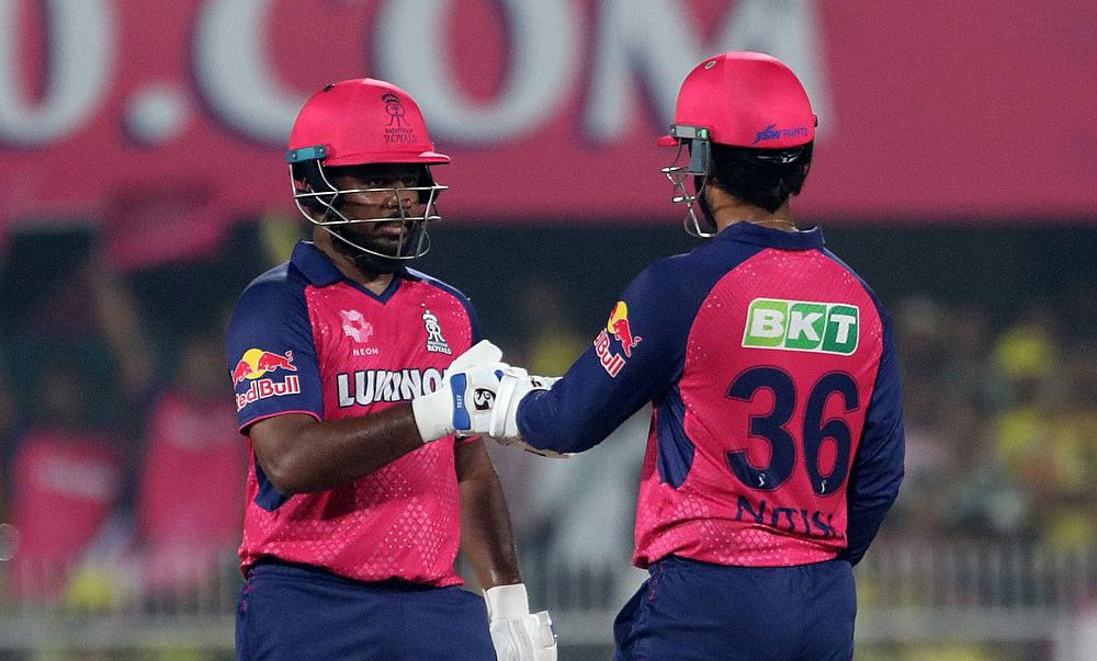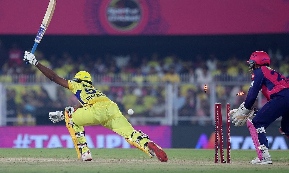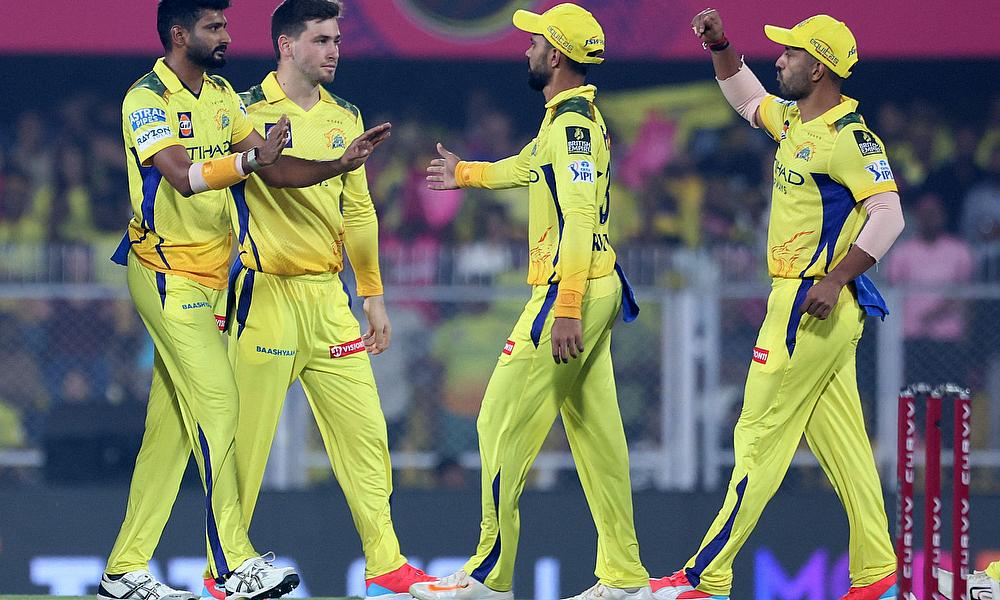 Chennai Super Kings' Khaleel Ahmed celebrates with teammates after taking the wicket of Rajasthan Royals' Yashasvi Jaiswal