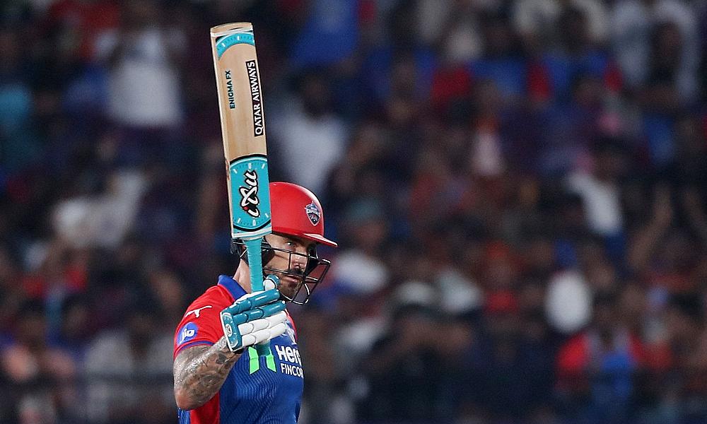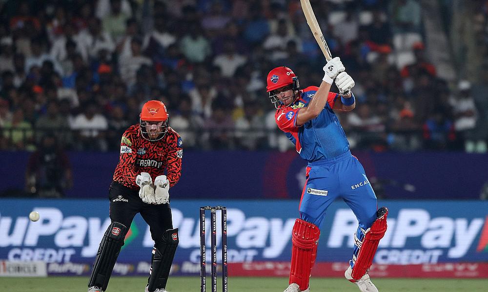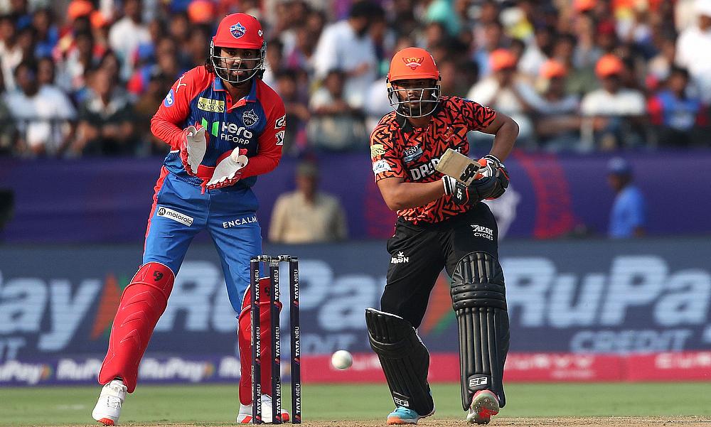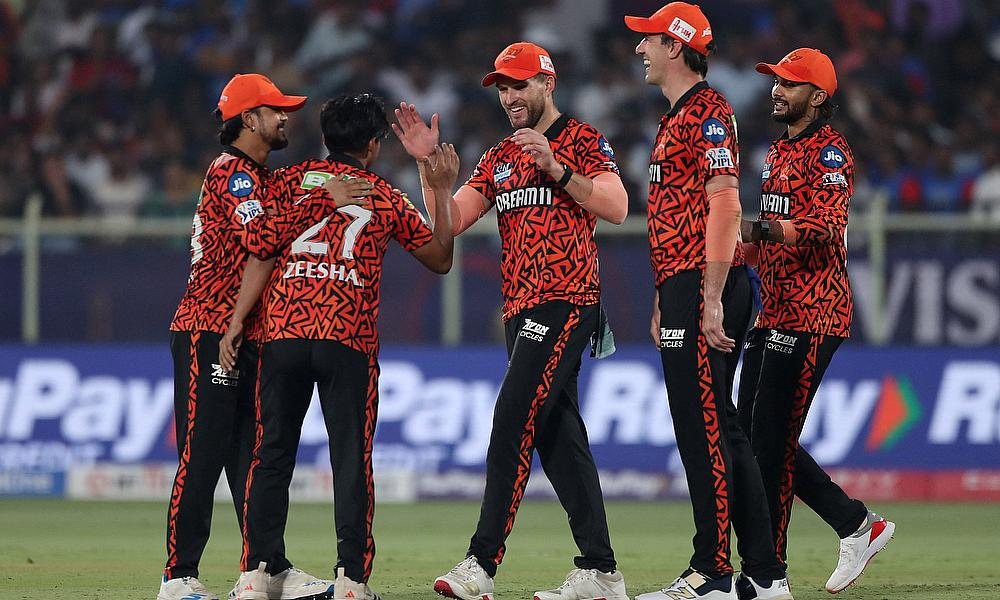 Sunrisers Hyderabad's Wiaan Mulder celebrates with teammates after taking a catch to dismiss Delhi Capitals' Faf Du Plessis