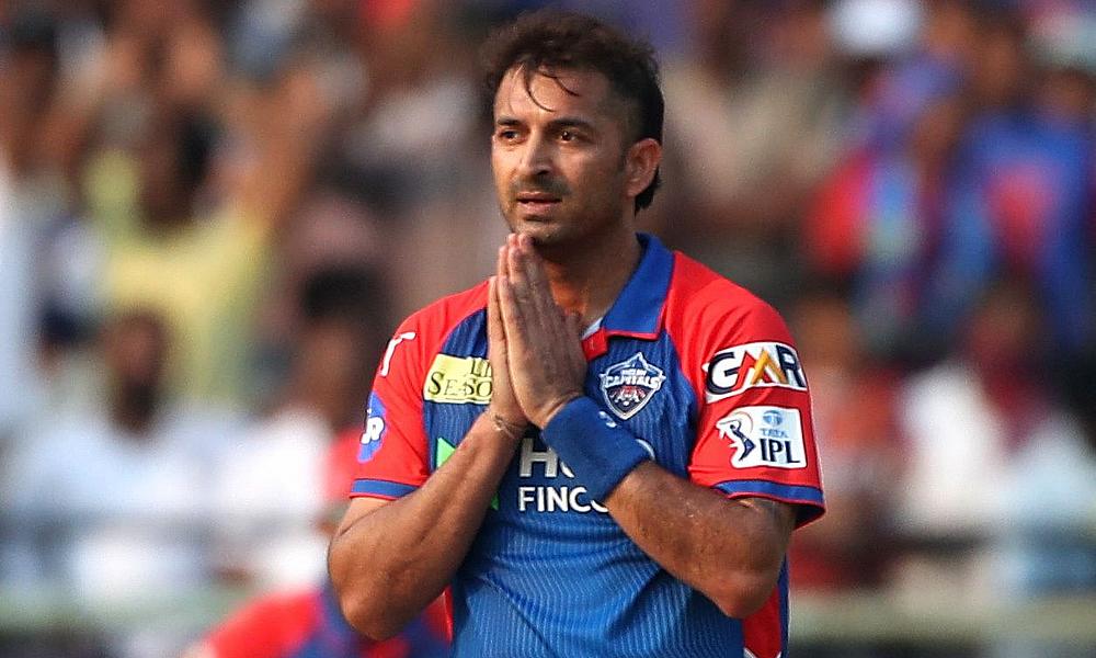 Delhi Capitals' Mohit Sharma celebrates after taking the wicket of Sunrisers Hyderabad's Heinrich Klaasen