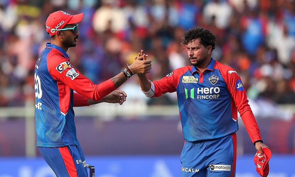 Delhi Capitals' Kuldeep Yadav celebrates with Axar Patel after taking athe wicket of Sunrisers Hyderabad's Abhinav Manohar