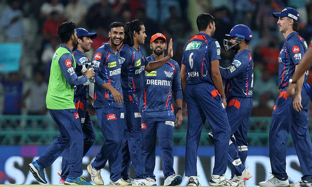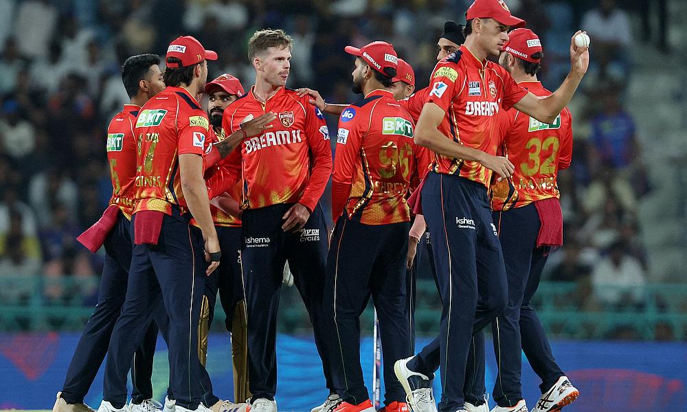 Punjab Kings' Lockie Ferguson celebrates with teammates after taking the wicket of Lucknow Super Giants' Aiden Markram
