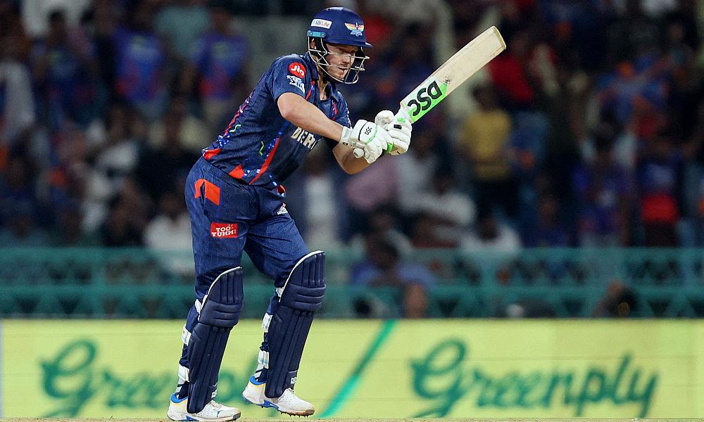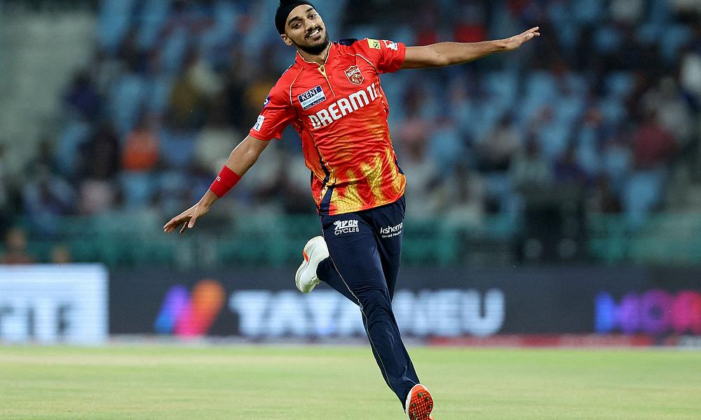 Punjab Kings' Arshdeep Singh celebrates after taking the wicket of Lucknow Super Giants' Mitchell Marsh