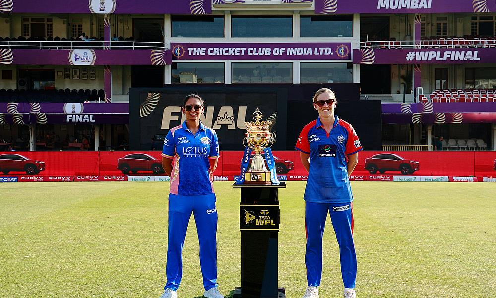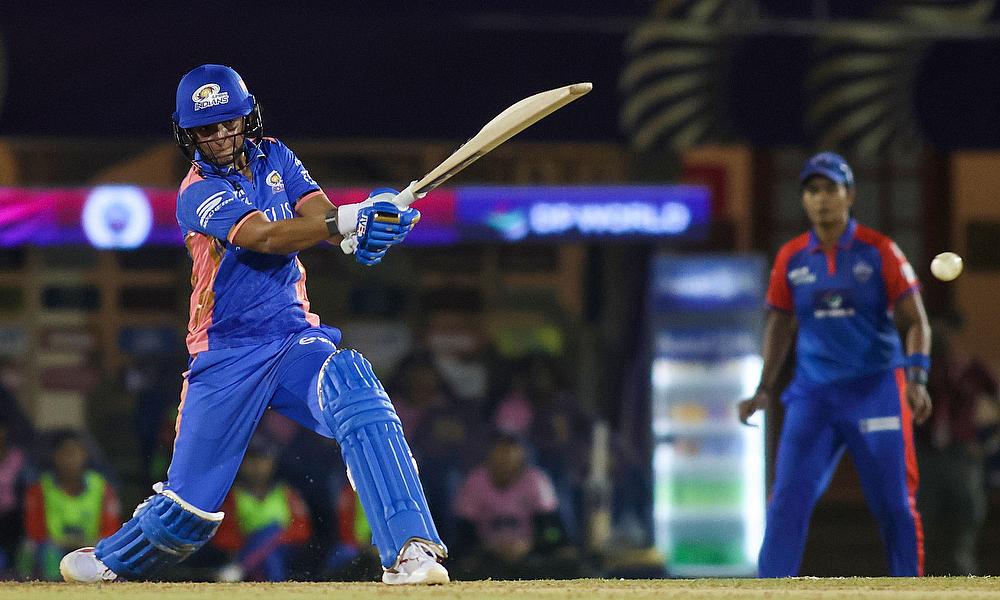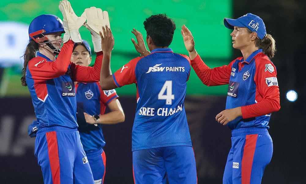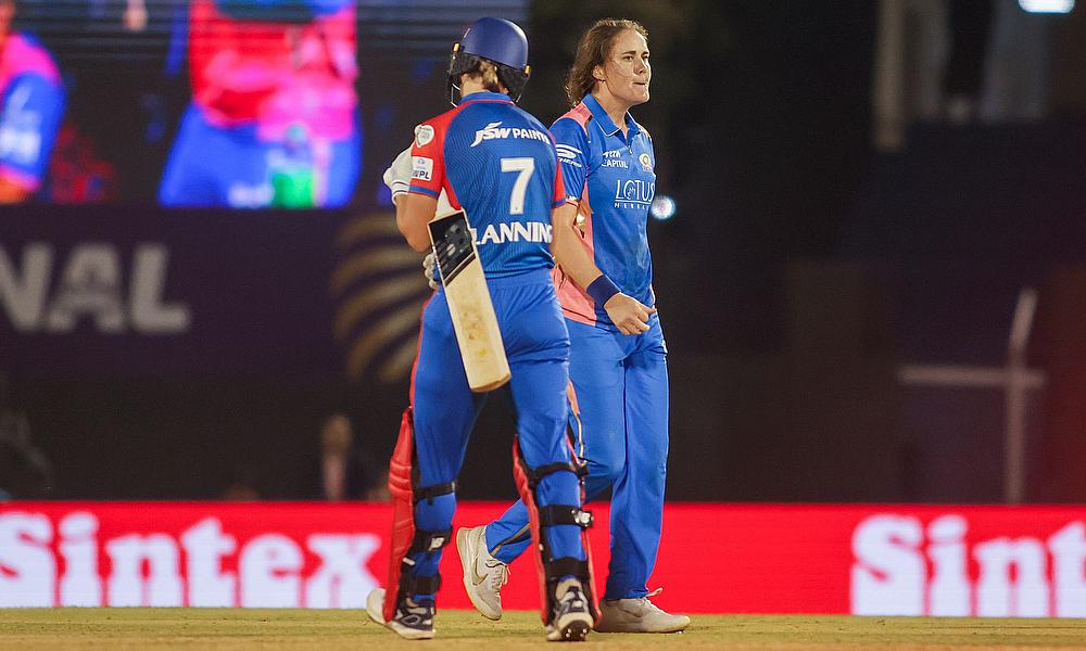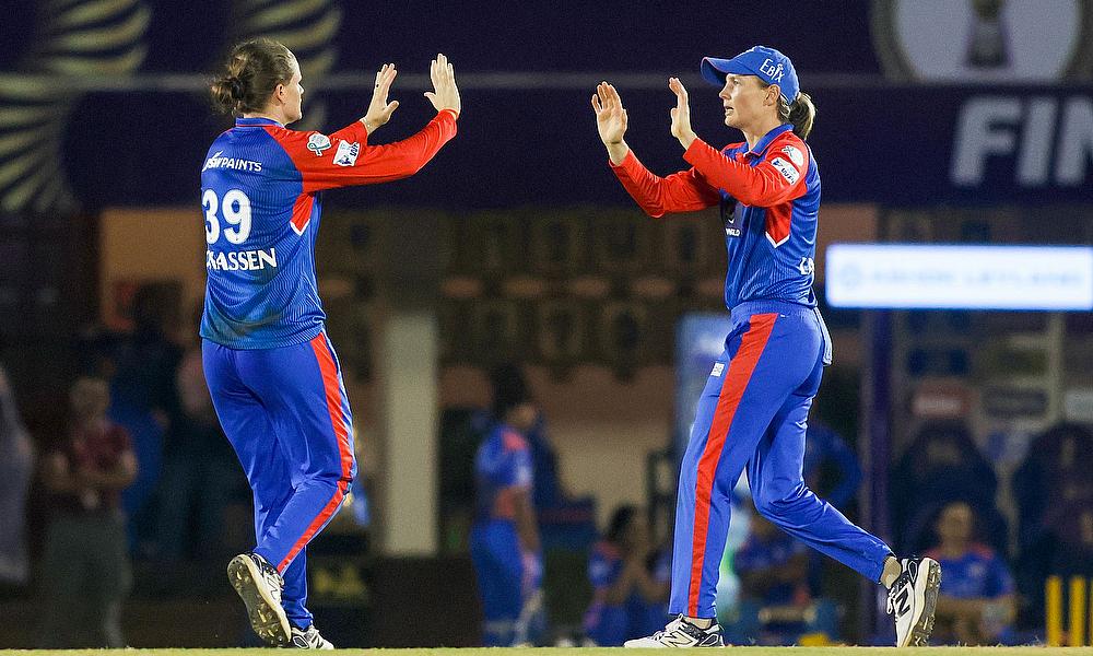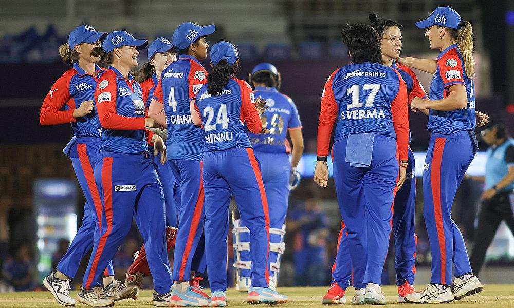 Mumbai Indians' Shabnim Ismail celebrates with teammates after dismissing Delhi Capitals' Shafali Verma