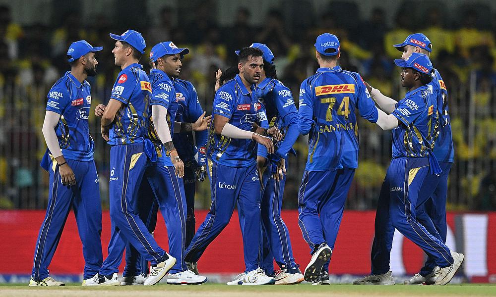 Mumbai Indians' Deepak Chahar celebrates with teammates the wicket of Chennai Super Kings' Rahul Tripathi
