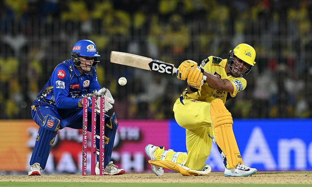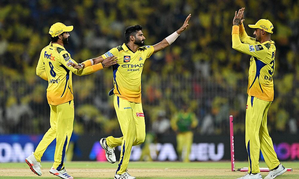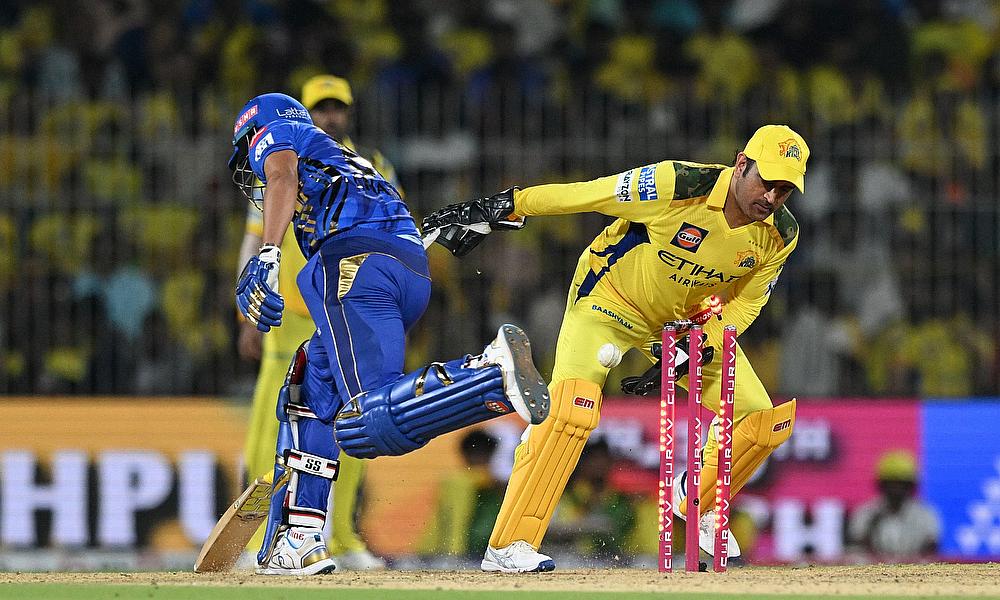 Mumbai Indians' Vignesh Puthur celebrates with teammates after the wicket of Chennai Super Kings' Shivam Dube