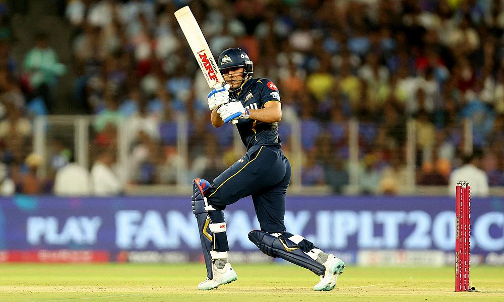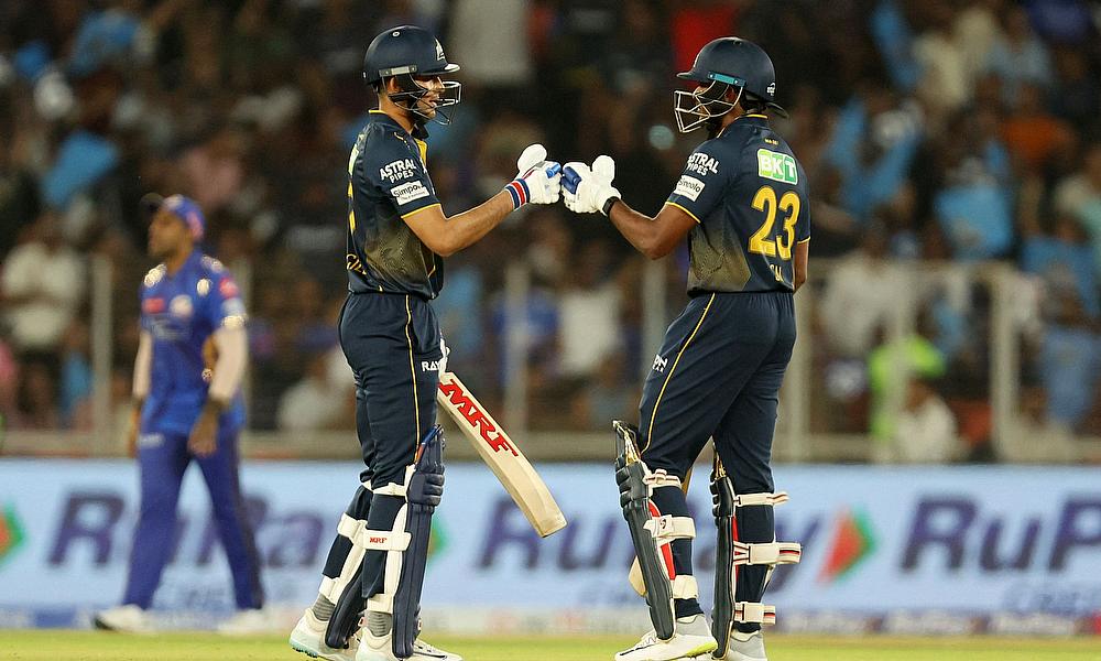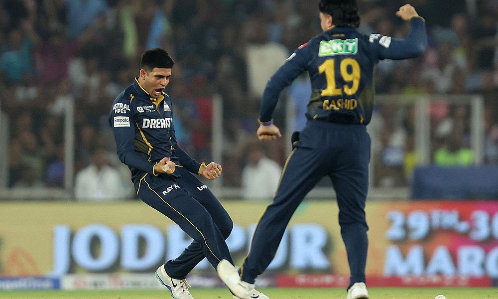 Gujarat Titans' Shubman Gill reacts after the lbw wicket of Mumbai Indians' Tilak Varma before it is overturned after DRS review