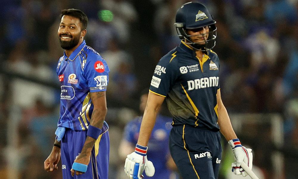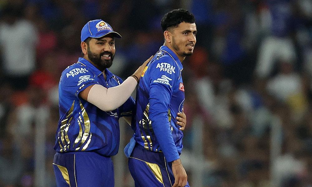 Mumbai Indians' Mujeeb Ur Rahman celebrates with Rohit Sharma after taking the wicket of Gujarat Titans' Jos Buttler