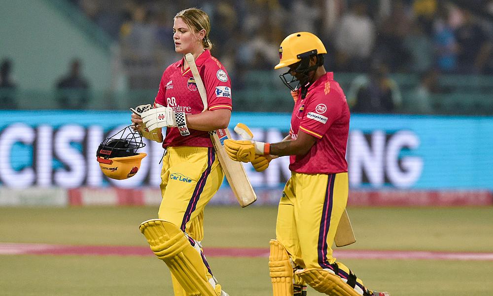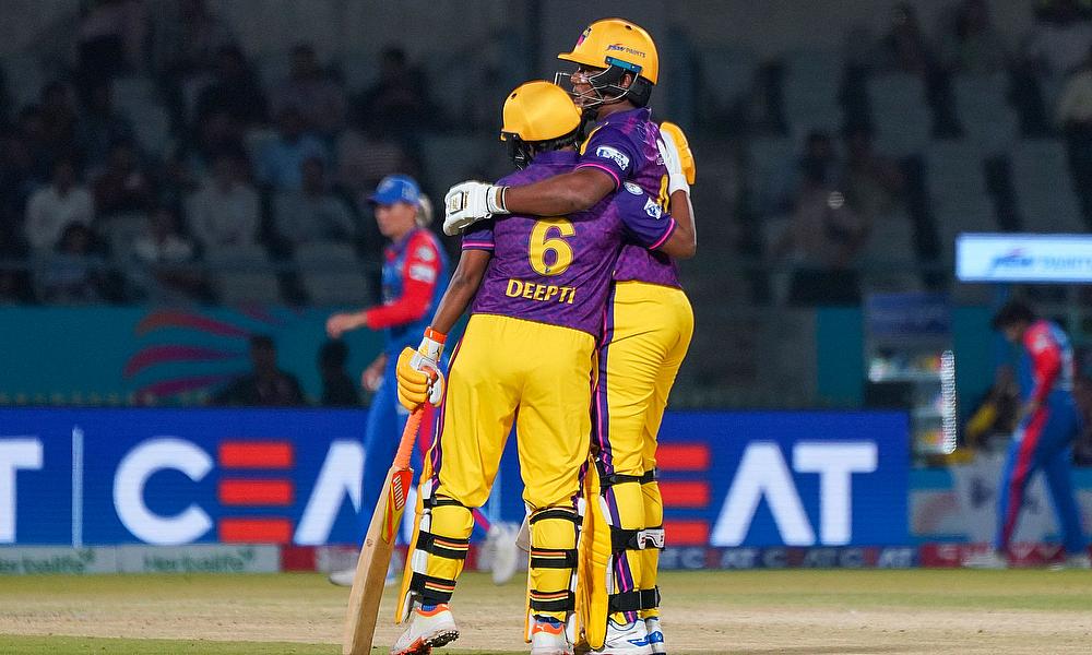 UP Warriorz's Chinelle Henry celebrates with Sophie Ecclestone