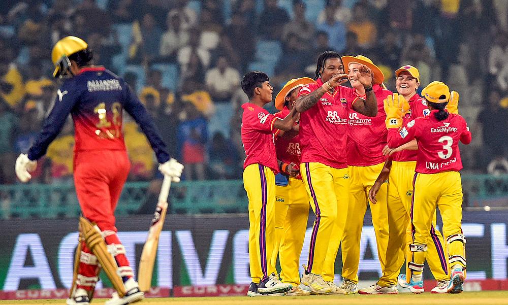 UP Warriorz players celebrate the dismissal of Royal Challengers Bengaluru's captain Smriti Mandhana