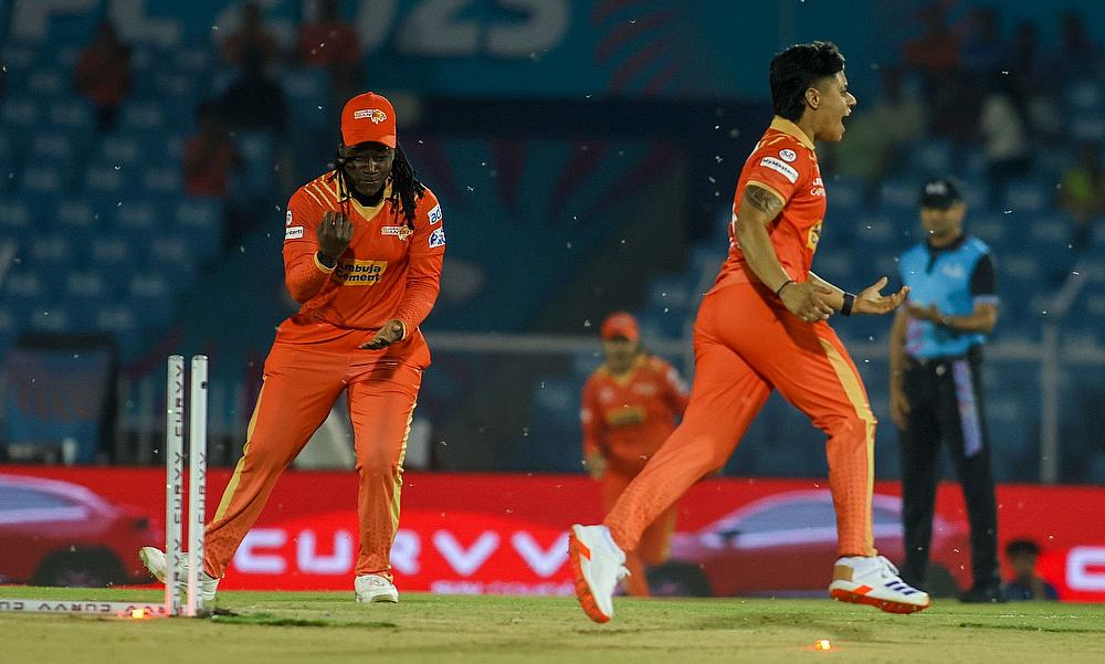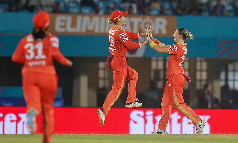 Gujarat Giants' Ashleigh Gardner celebrates with teammates after dismissing UP Warriorz' Vrinda Dinesh