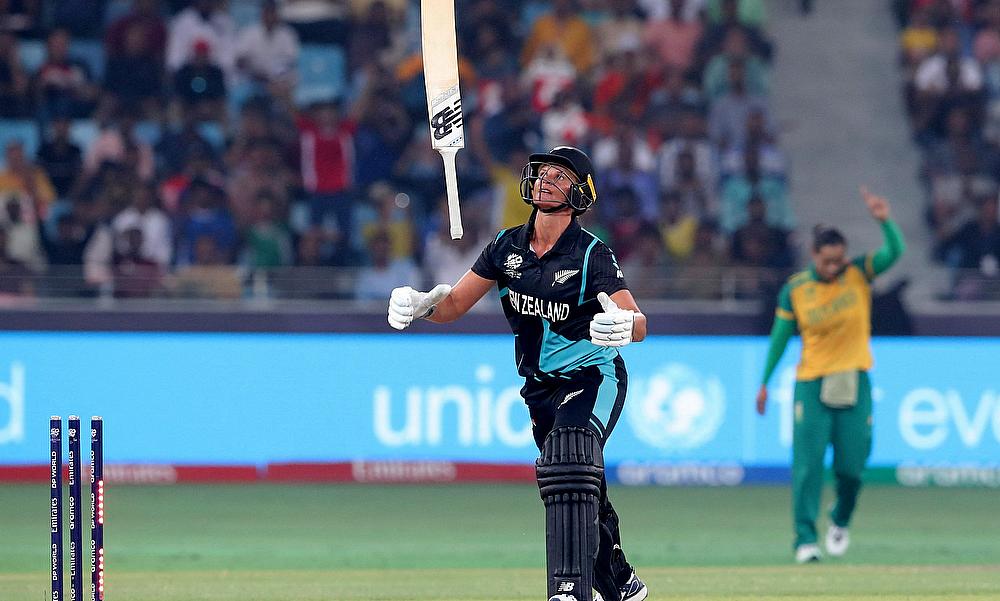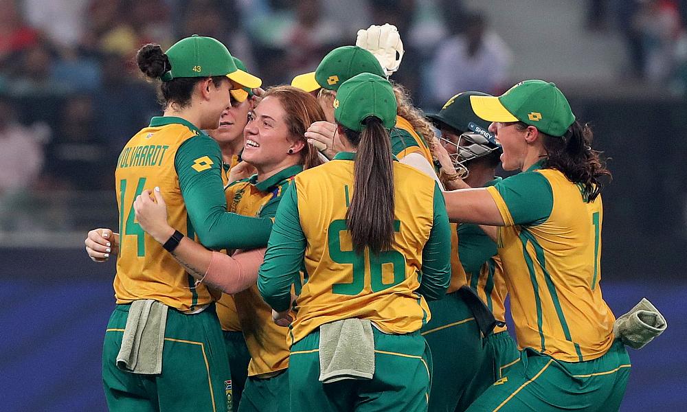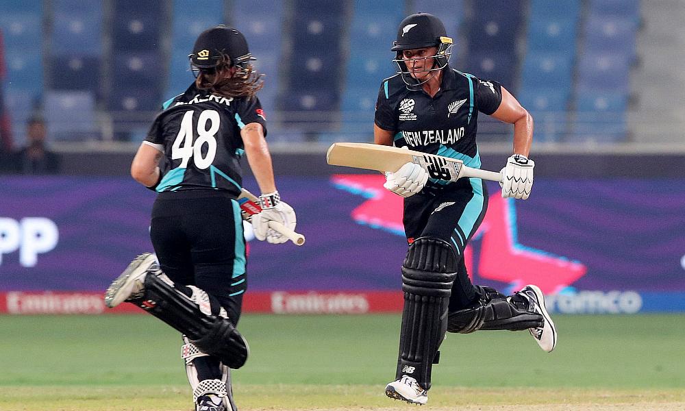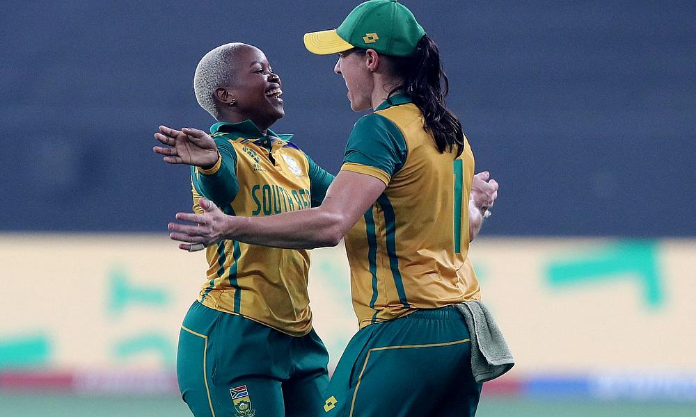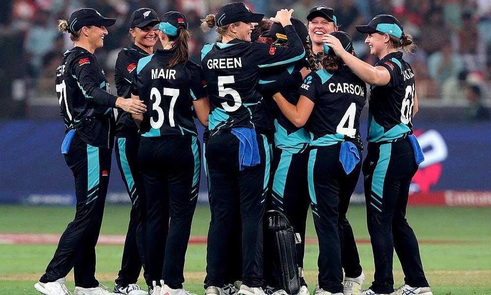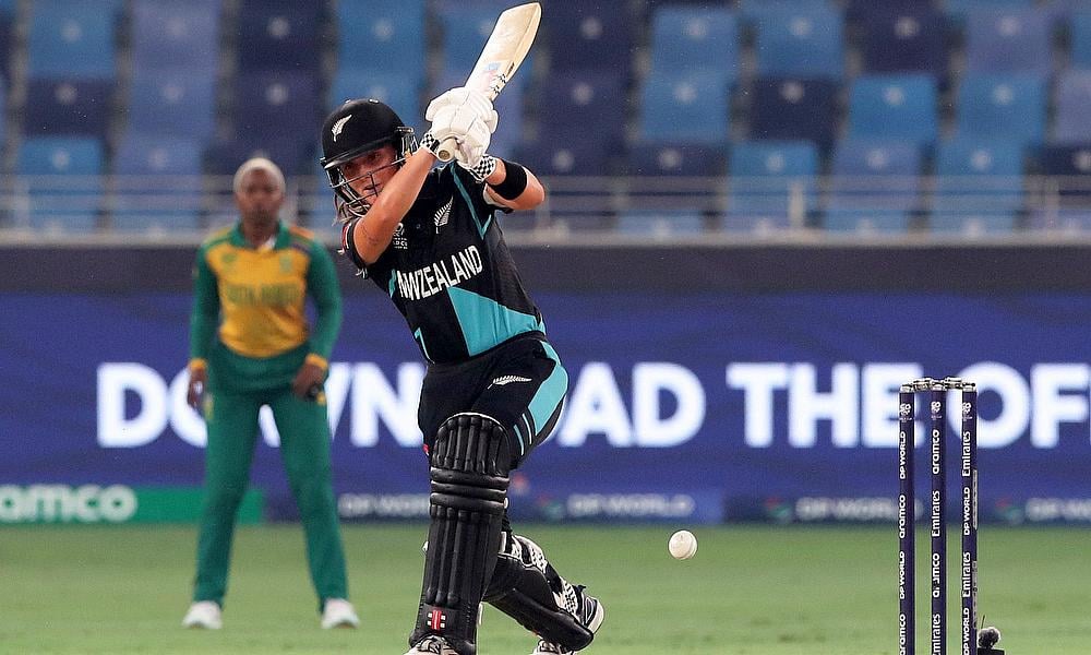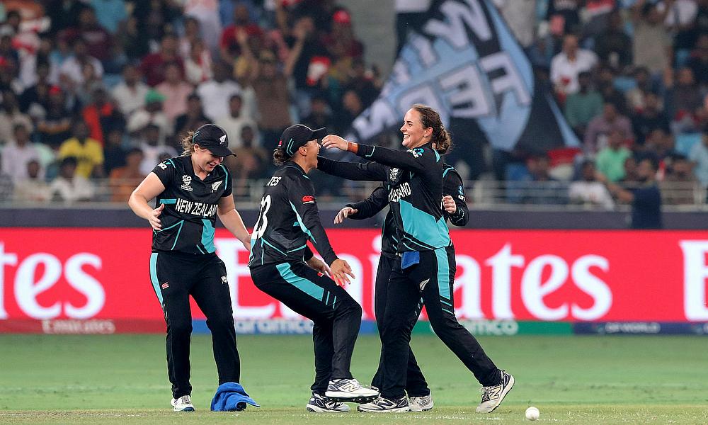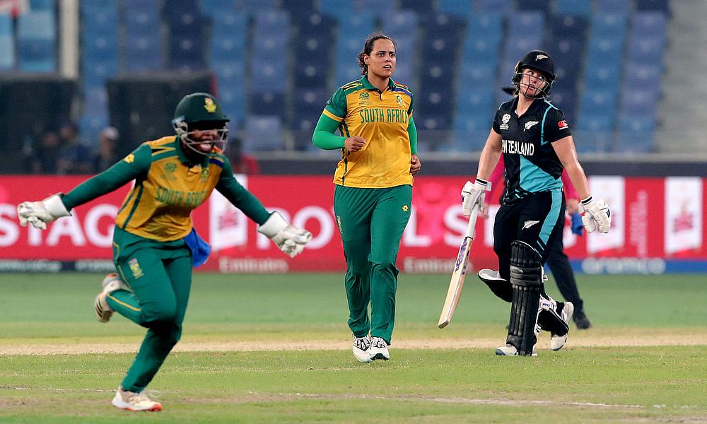 New Zealand's Suzie Bates celebrates after taking a catch to dismiss South Africa's Laura Wolvaardt off the bowling of Amelia Kerr