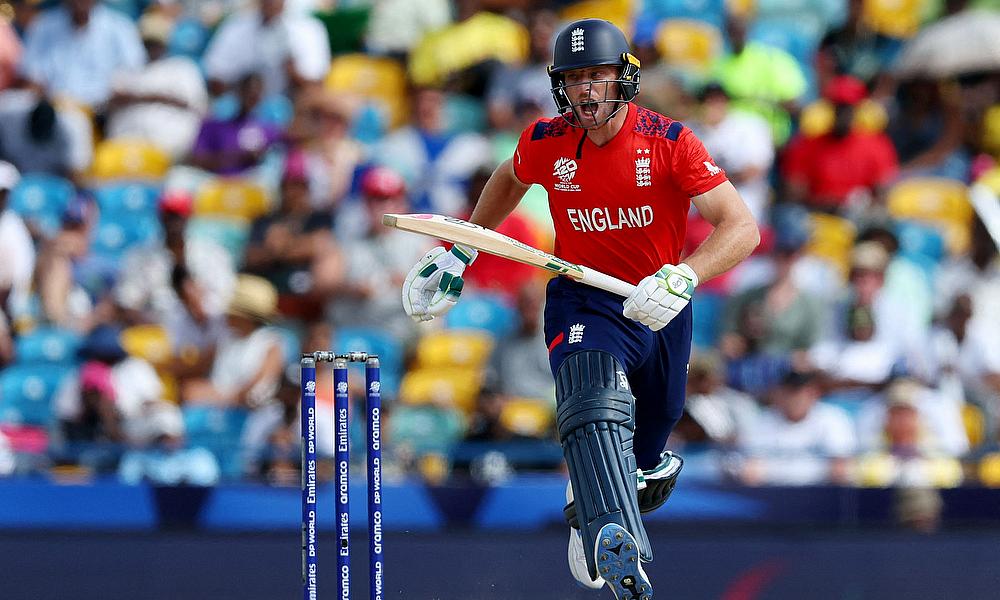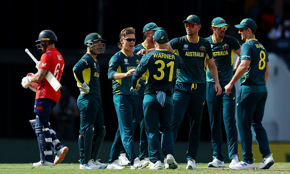 Australia's Adam Zampa celebrates with teammates after taking the wicket of England's Phil Salt