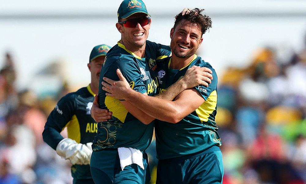 Australia's Marcus Stoinis celebrates with Josh Hazlewood after taking the wicket of England's Will Jacks