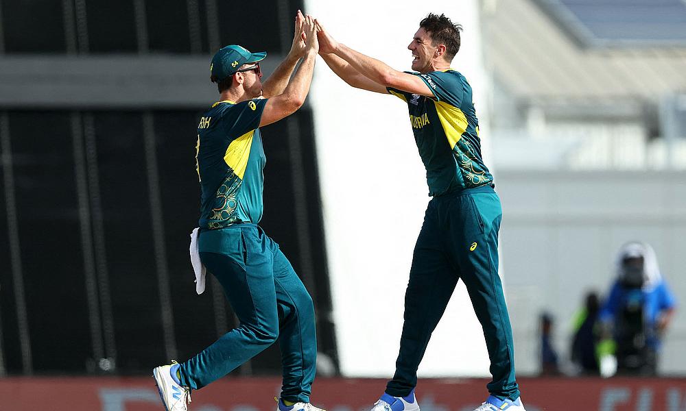 Australia's Pat Cummins and Mitchell Marsh celebrate after taking the wicket of England's Moeen Ali