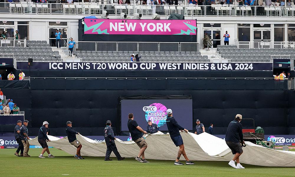 Ground staff pull the rain covers onto the pitch as the start of play is delayed