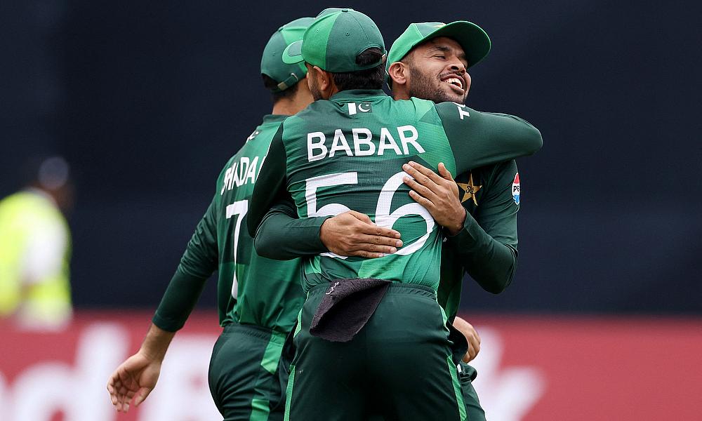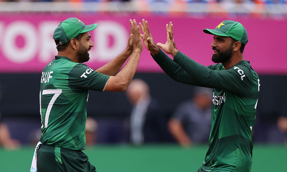 Pakistan's Haris Rauf celebrates with Fakhar Zaman after catching out India's Rohit Sharma
