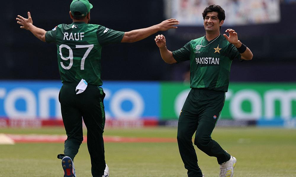 Pakistan's Naseem Shah celebrates with Haris Rauf after taking the wicket of India's Shivam Dube
