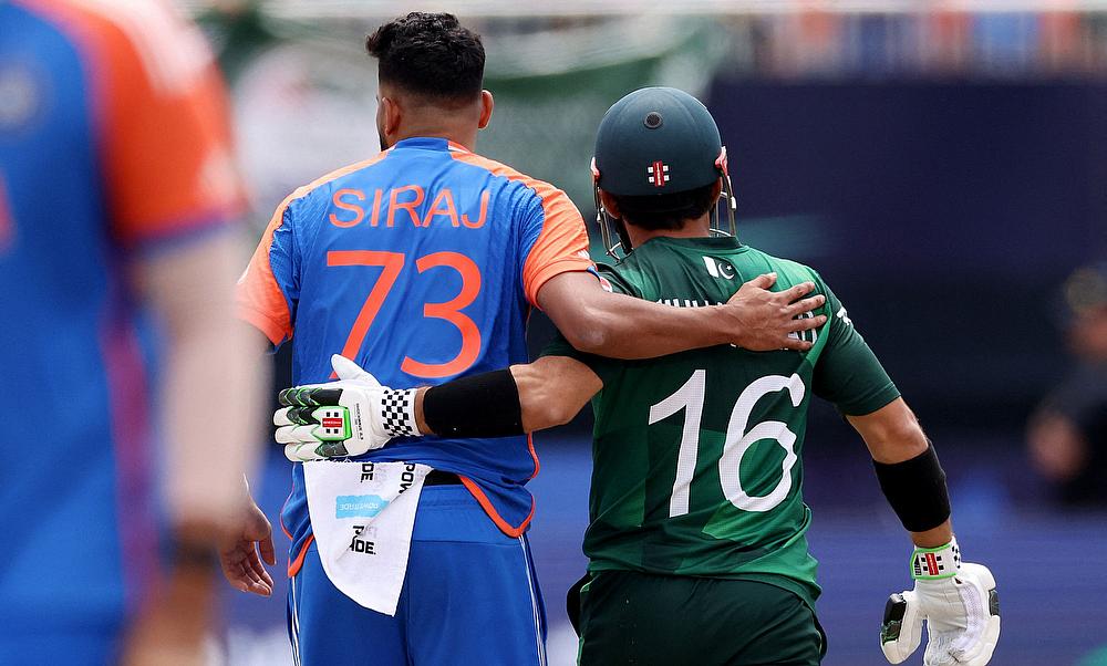India's Mohammed Siraj with Pakistan's Mohammad Rizwan during the match