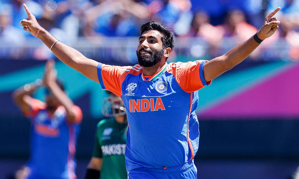 India's Jasprit Bumrah celebrates after taking the wicket of Pakistan's captain Babar Azam