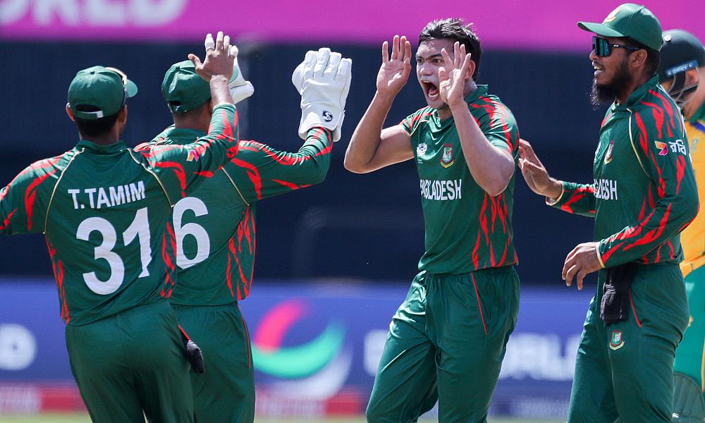 Bangladesh's Taskin Ahmed celebrates with teammates