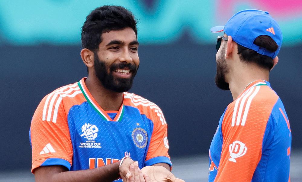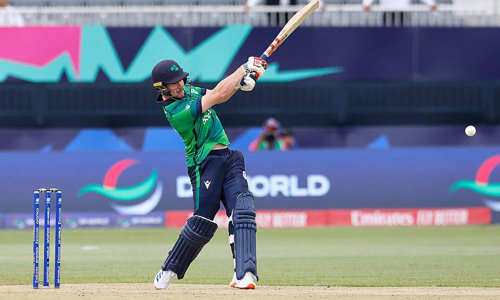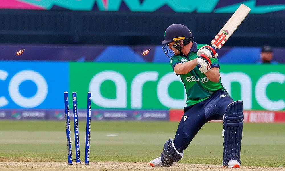 Ireland's Joshua Little is bowled out by India's Jasprit Bumrah