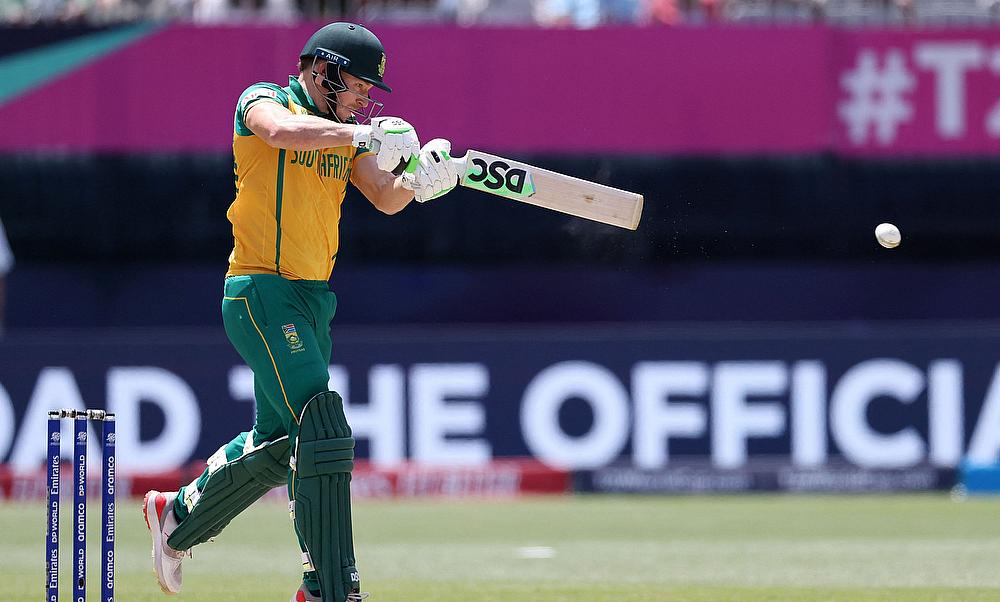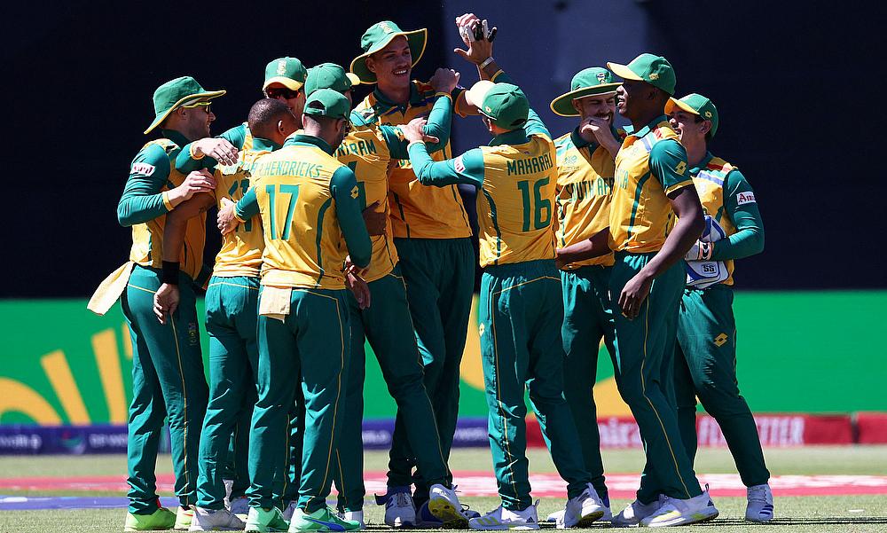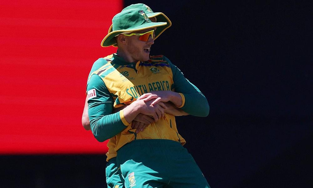 South Africa's David Miller celebrates after taking the wicket of Netherlands' Bas de Leede