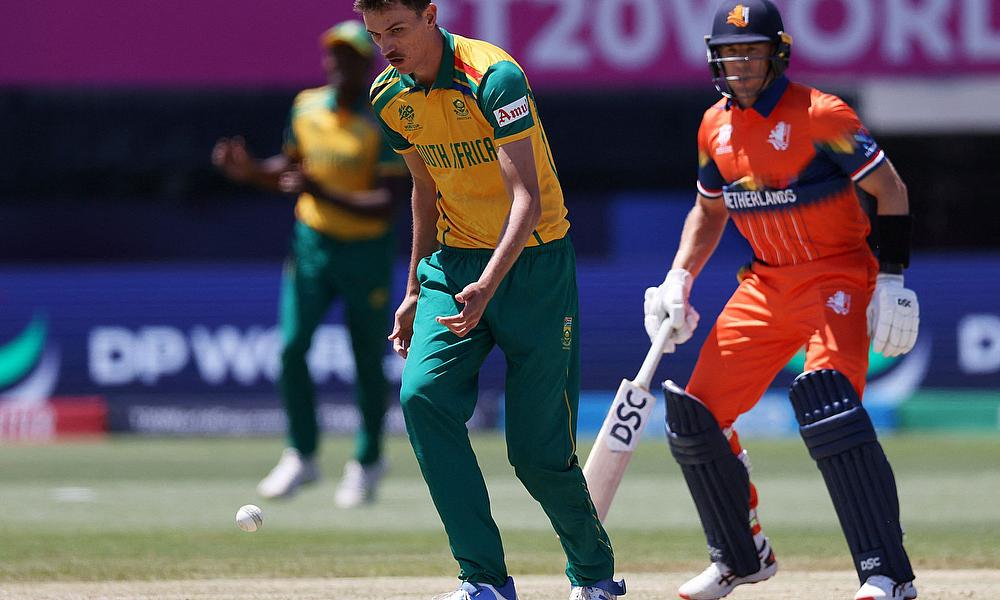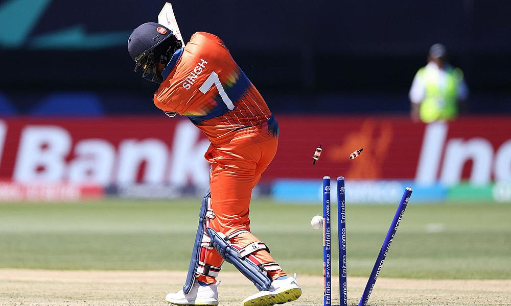 Netherlands' Vikramjit Singh is bowled out by South Africa's Marco Jansen