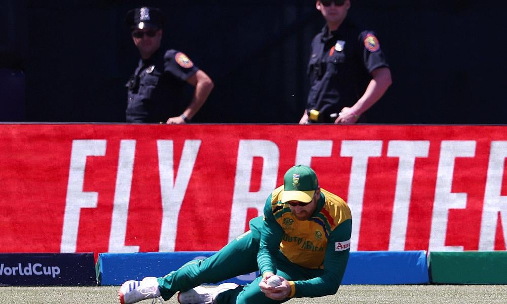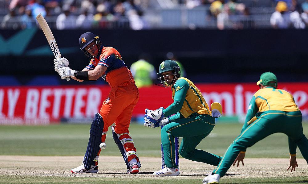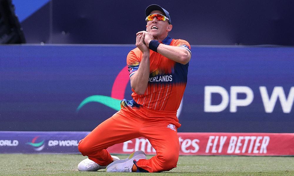 South Africa's Heinrich Klaasen takes the catch of Netherlands' Teja Nidamanuru