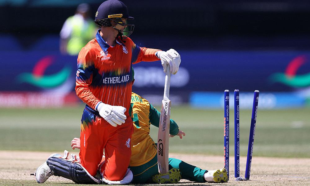 Netherlands' Scott Edwards looks dejected after being run out by South Africa's Aiden Markram