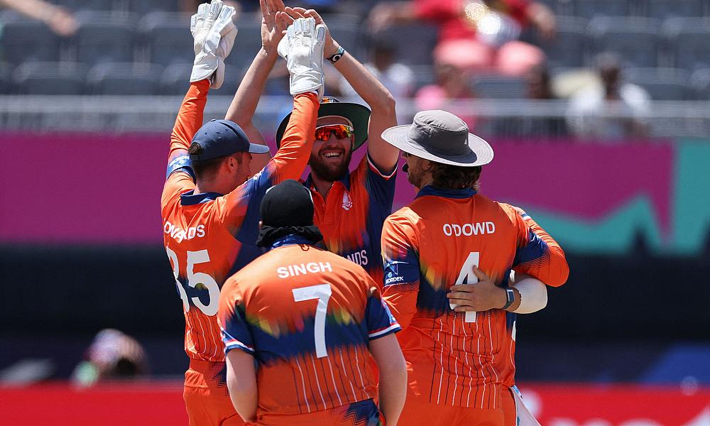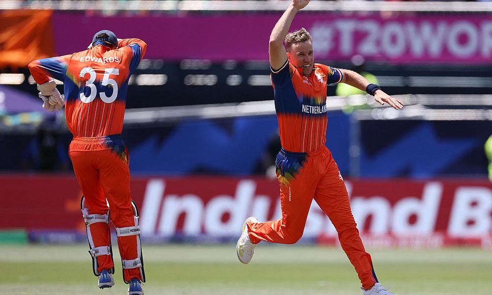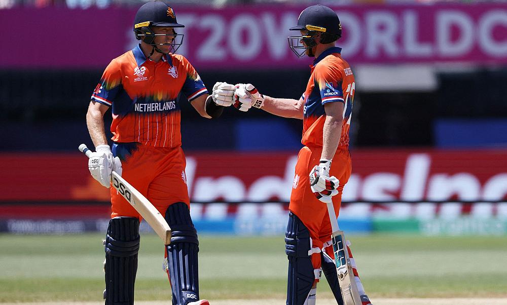 Netherlands' Logan van Beek and SA Engelbrecht celebrate four runs