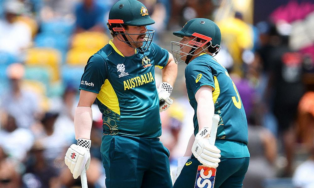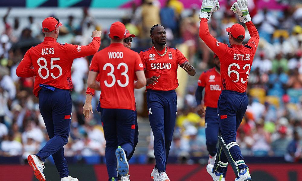 England's Jofra Archer celebrates with teammates after taking the wicket of Australia's Travis Head