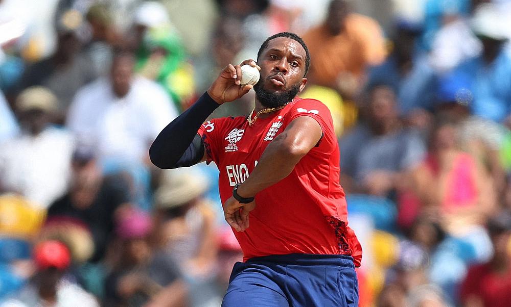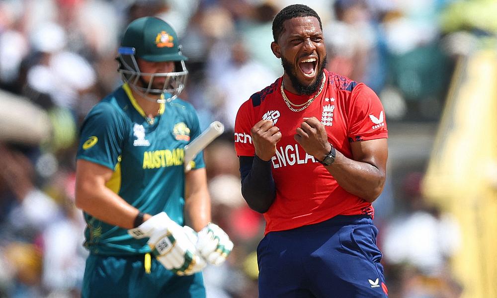 England's Chris Jordan celebrates after taking the wicket of Australia's Tim David