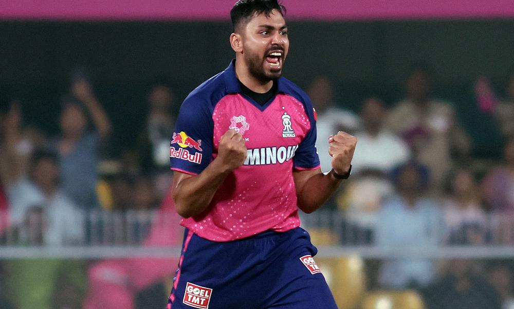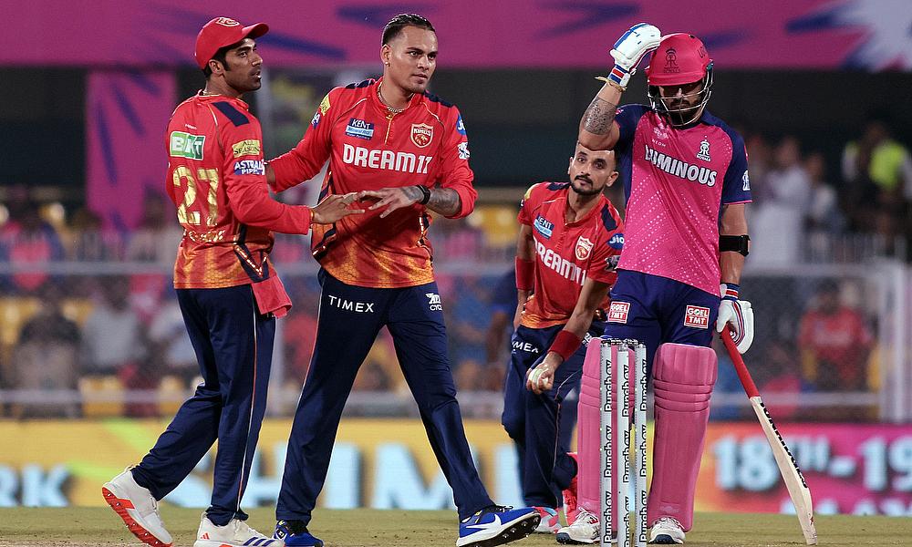 Rajasthan Royals' Avesh Khan celebrates the wicket of Punjab Kings' Rilee Rossouw