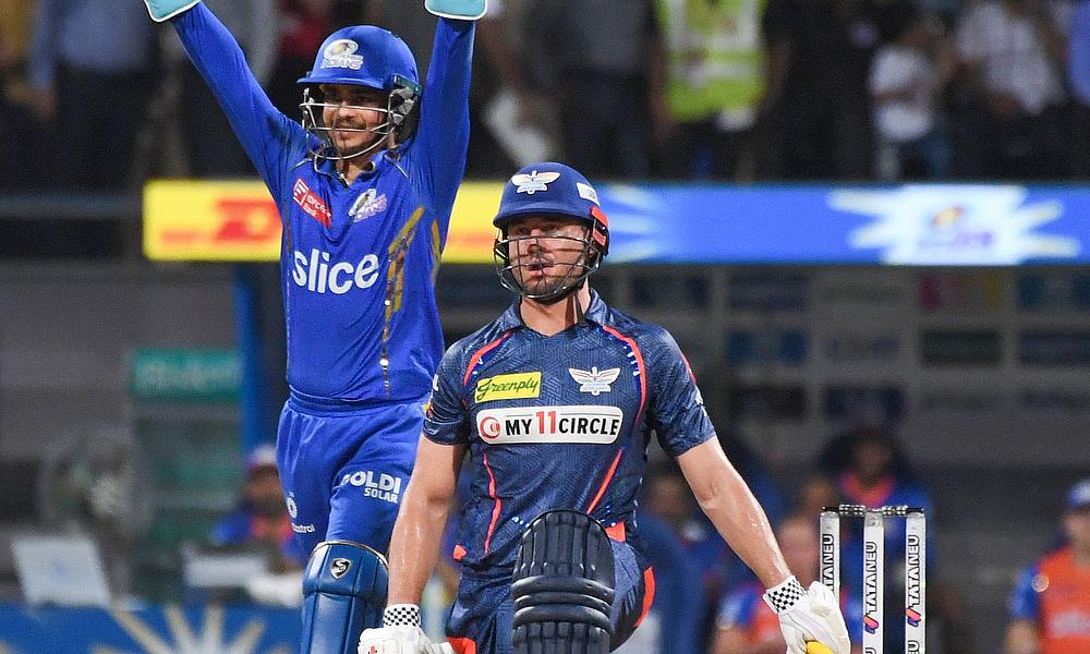 Lucknow Super Giants' Ravi Bishnoi celebrates the dismissal of Mumbai Indians' Rohit Sharma