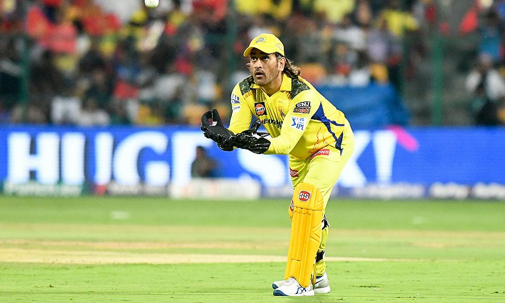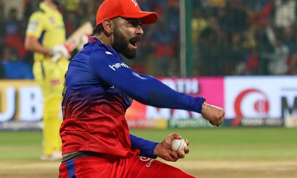 Royal Challengers Bengaluru's Virat Kohli celebrates after taking a catch to dismiss Chennai Super Kings' Daryl Mitchel
