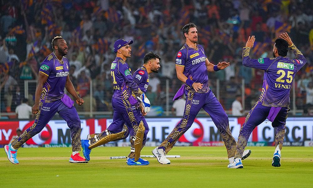 Kolkata Knight Riders' Mitchell Starc celebrates with teammates after taking the wicket of Sunrisers Hyderabad's Travis Head during the IPL 2024