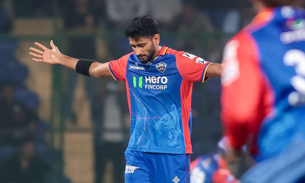 Delhi Capitals' Khaleel Ahmed celebrates after taking the wicket of Rajasthan Royals' Yashasvi Jaiswal
