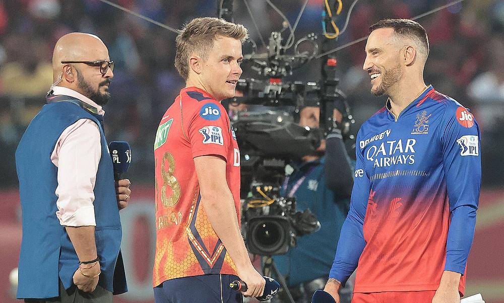 Punjab Kings' captain Sam Curran and Royal Challengers Bengaluru' captain Faf du Plessis during the toss before the start of the IPL