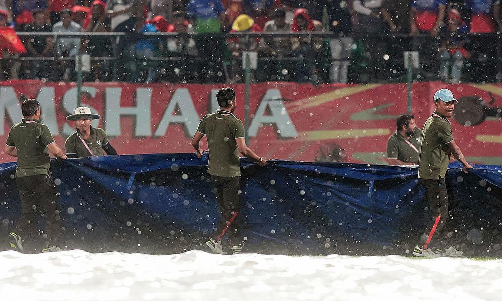 Groundsmen run to cover the ground as rain interrupts